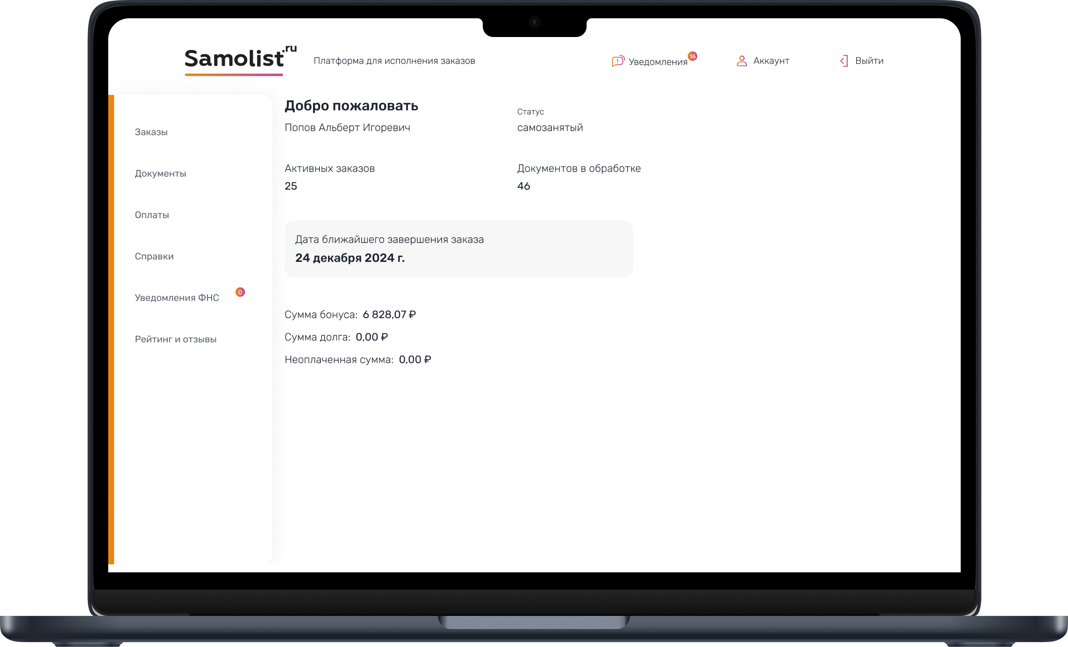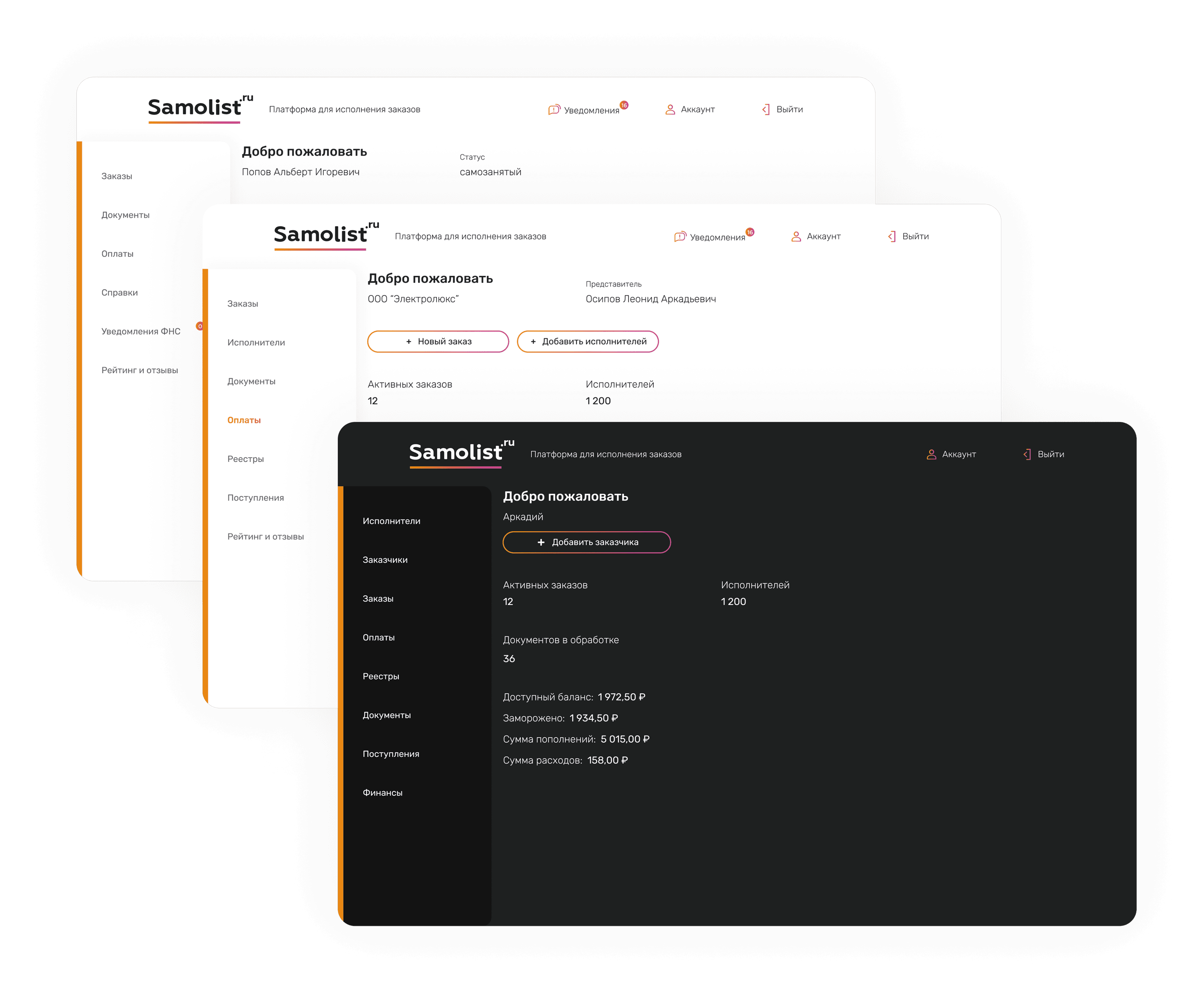 Реализовали личные кабинеты исполнителей для Самозанятых, Физлиц, Заказчика и Оператора платформы