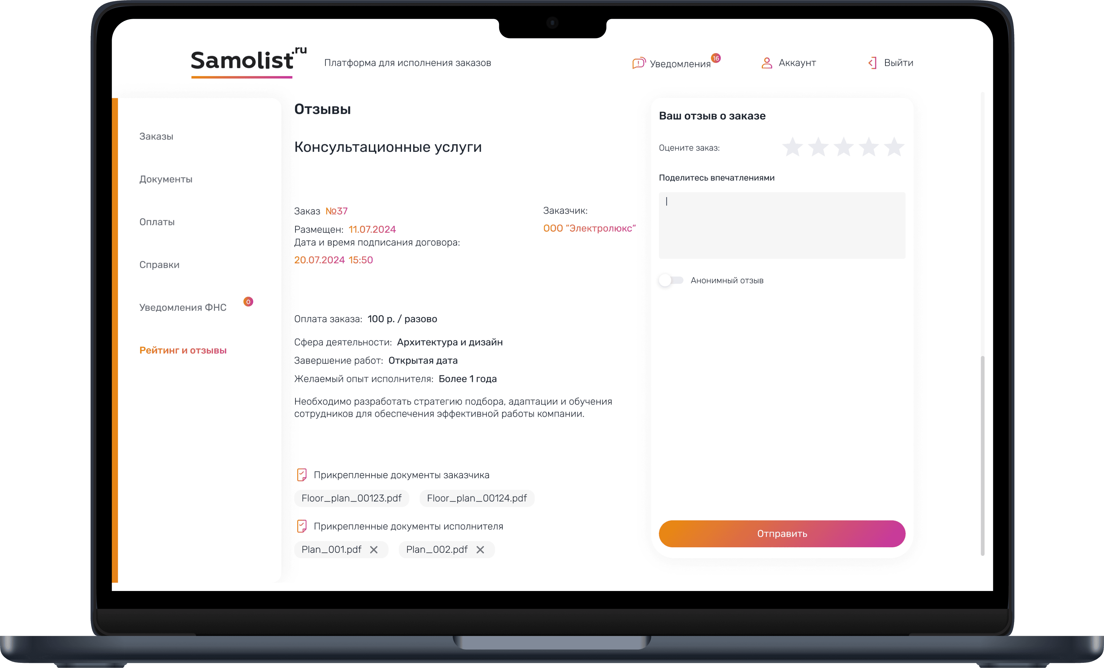 Рейтинг и отзывы позволяют пользователям высказать мнение и повышают доверие. Модерация отзывов поддерживает качество информации, помогая заказчикам и исполнителям