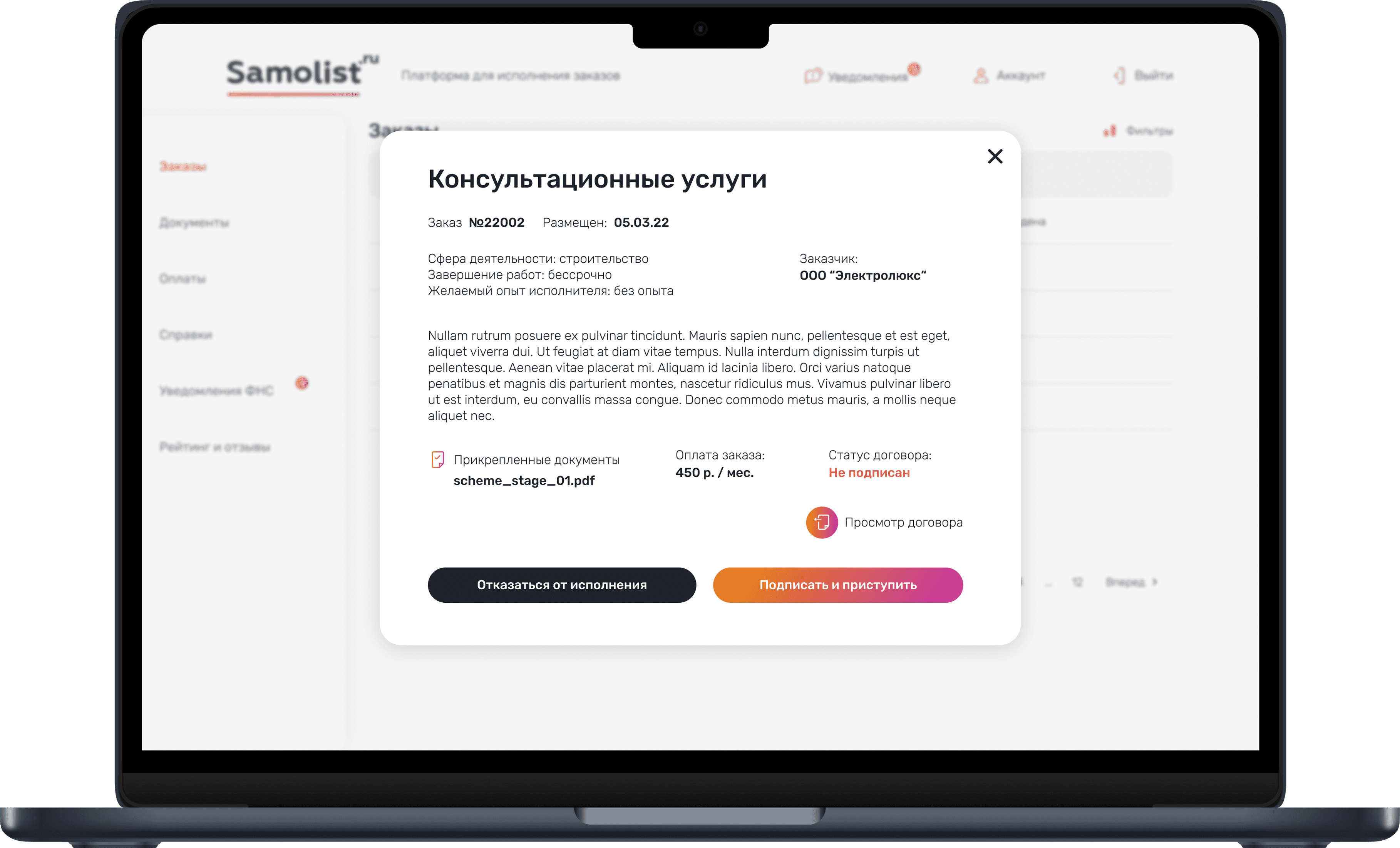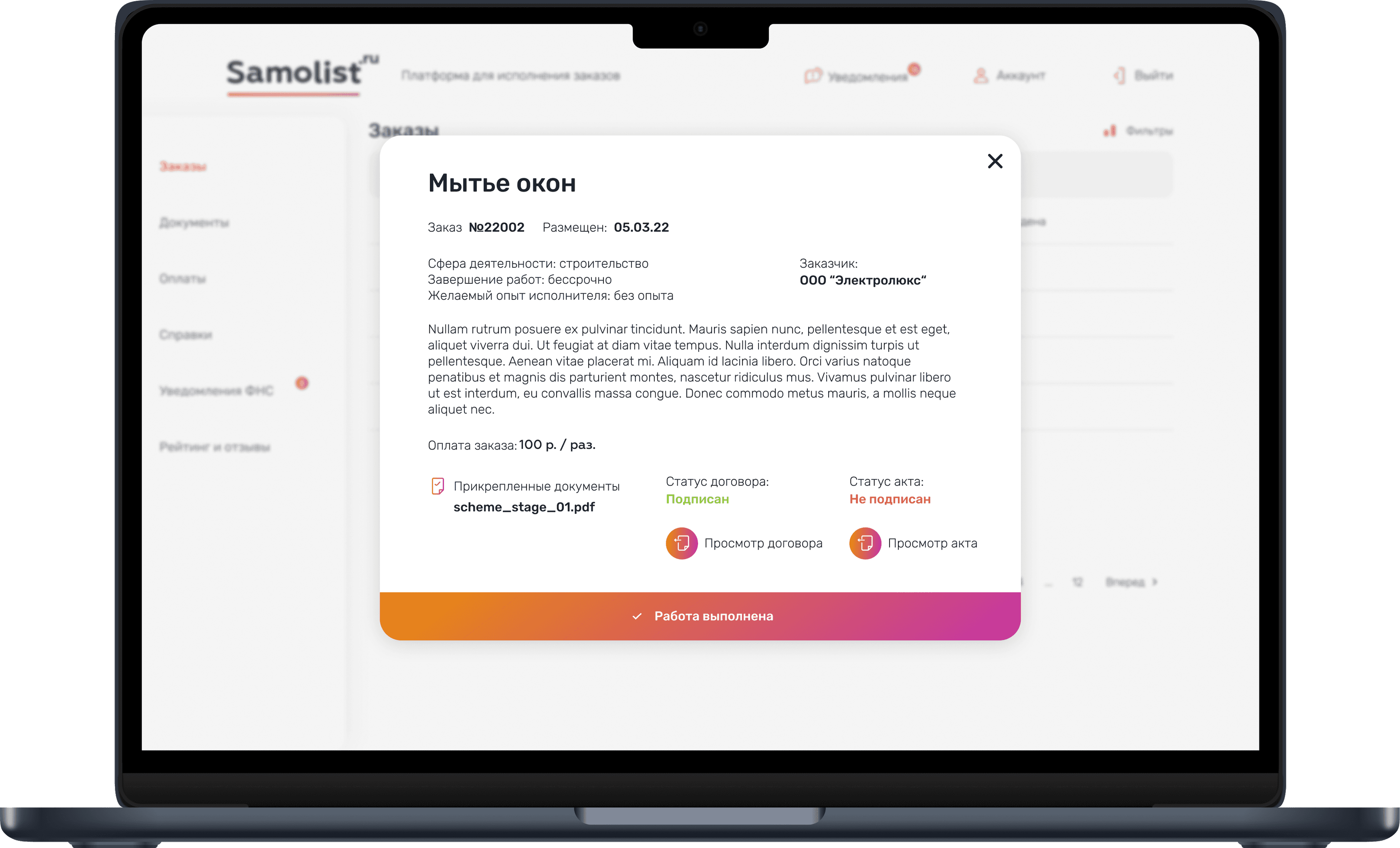 Провели интеграцию и регистрацию платформы в ФНС, что является гарантом прозрачности и законности работ, позволяя вести документооборот и проводить оплаты в одном приложении